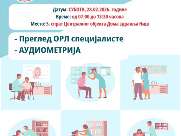 У суботу 28.02.2026.године Дом здравља Ниш организује акцију превентивних прегледа код специјалисте оториноларингологије. У оквиру акције свим заинтересованим грађанима без упута и заказивања радиће се преглед уха, грла и носа, као и аудиометрија.