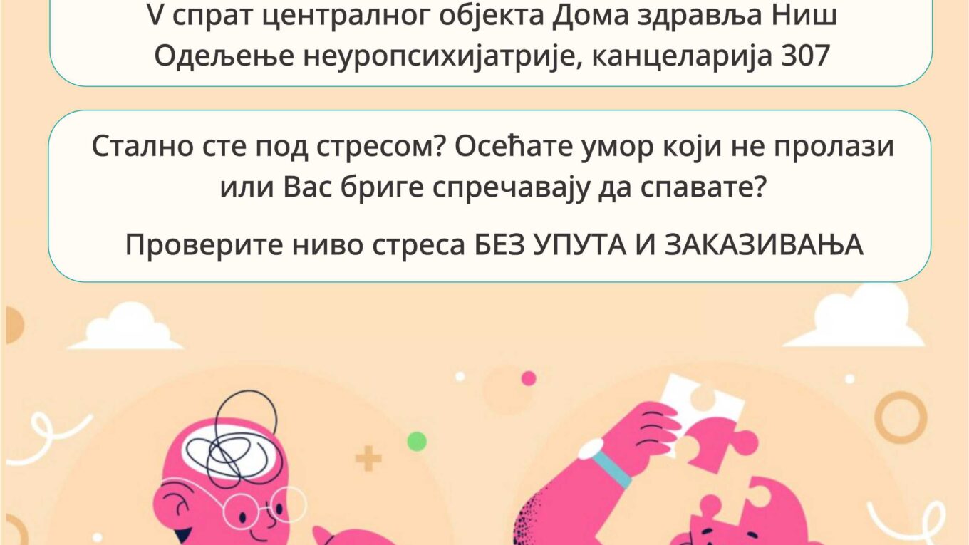 Одељење неуропсихијатрије Дома здравља Ниш у суботу 02.05.2026. године у периоду од 07:00 до 13:30 часова у својим просторијама на петом спрату, ординација 307, организује акцију превентивно-промотивног карактера под називом „Дан отворених врата за Ваше ментално здравље“.