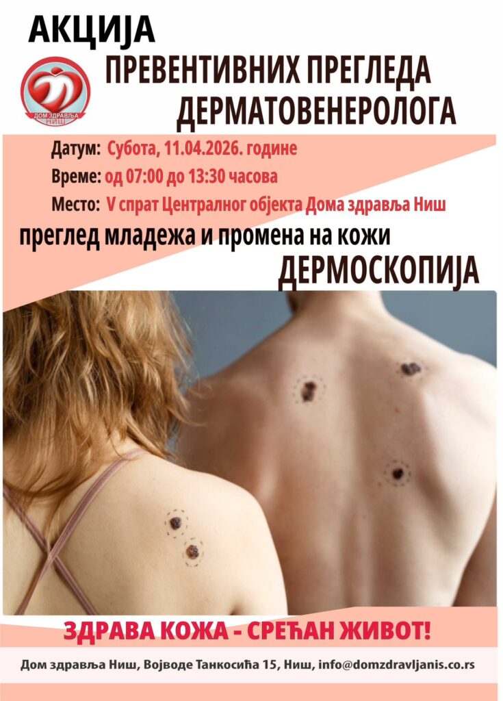 У суботу 11.04.2026. године Одељење дерматовенерологије Дома здравља Ниш организује акцију превентивних прегледа код специјалисте дерматовенерологије.
