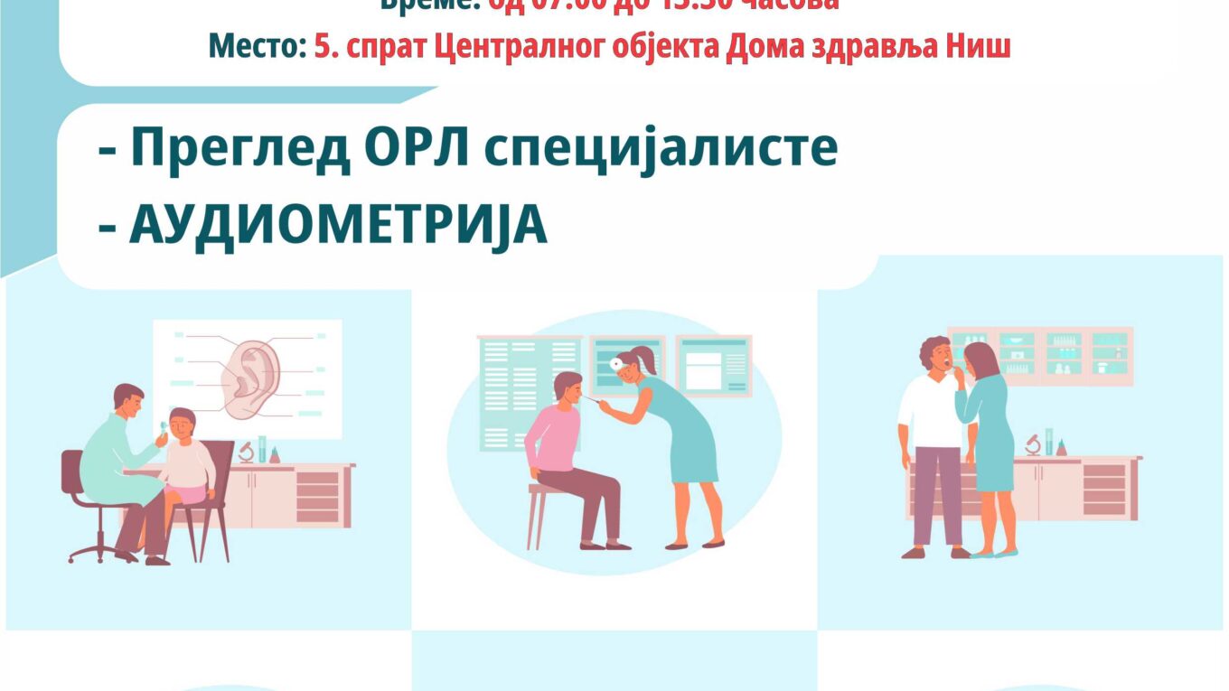 У суботу 28.03.2026. године Дом здравља Ниш организује акцију превентивних прегледа код специјалисте оториноларингологије.