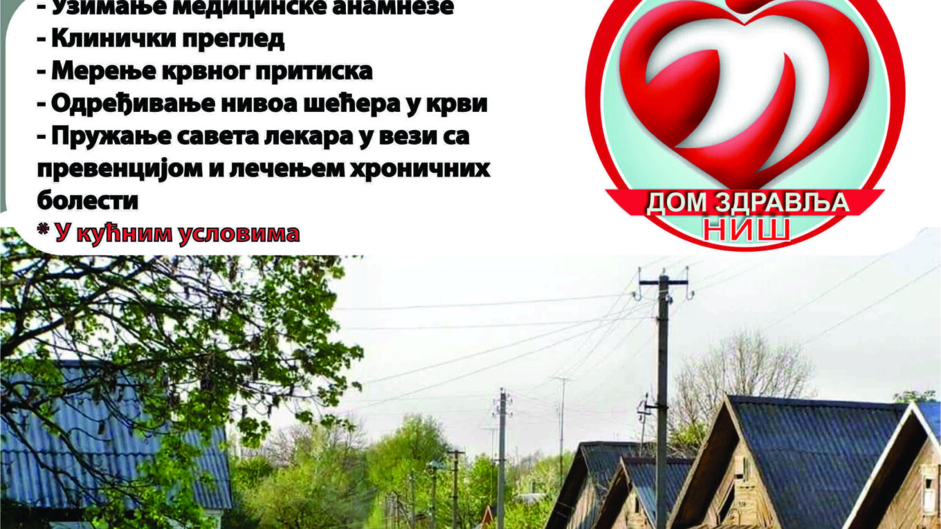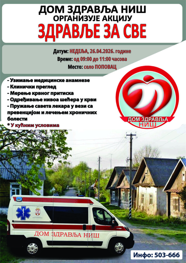 Медицинска екипа Дома здравља Ниш има за циљ да овог викенда 26.04.2026. године у периоду од 09:00 до 11:00 часова обиђе мештане села Поповац и том приликом пружи здравствене услуге попут: мерења крвног притиска, одређивања нивоа шећера у крви, клинички преглед, узимање медицинске анамнезе и подела савета лекара у вези са превенцијом и лечењем хроничних болести.