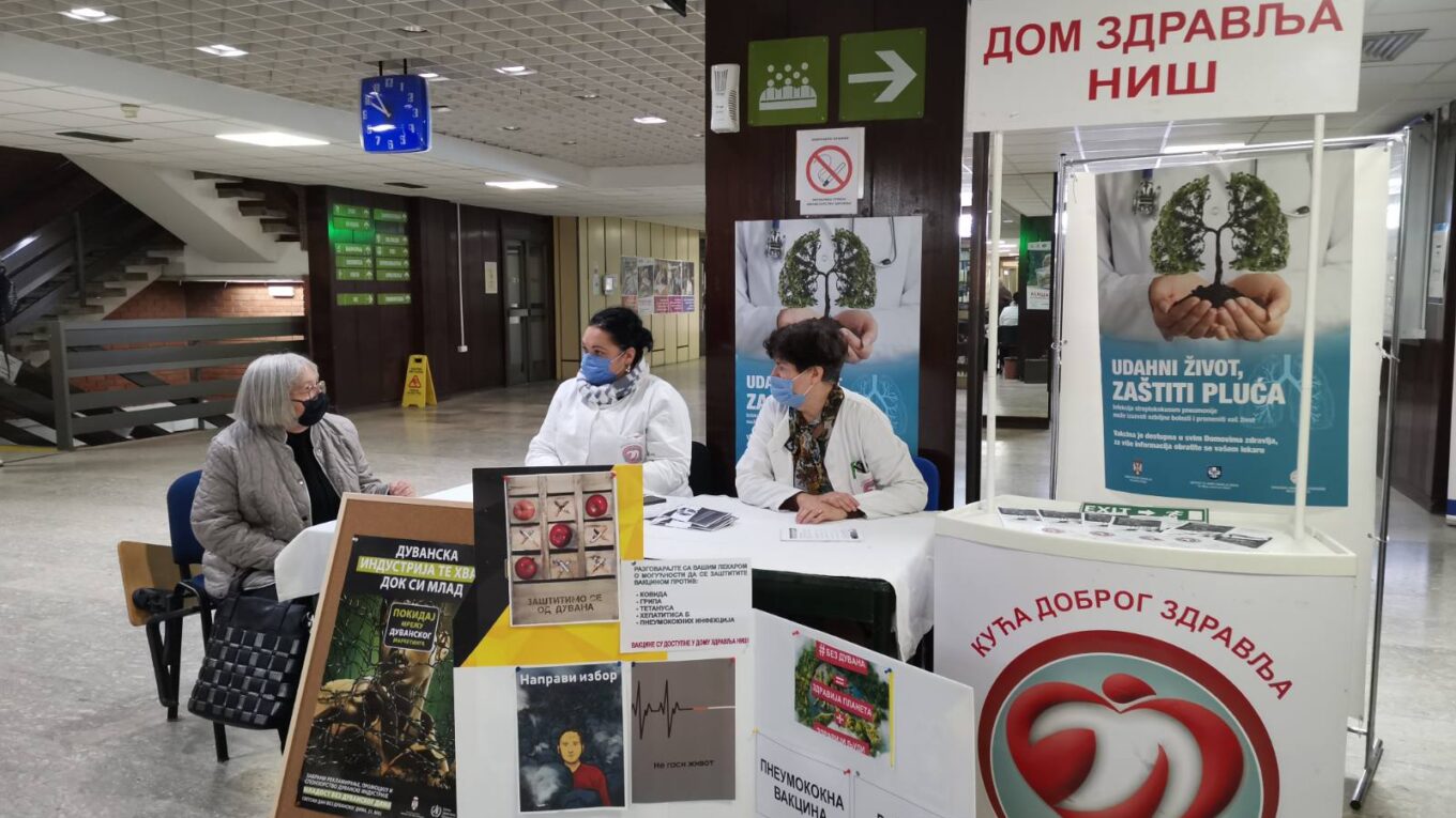 Медицинске екипе Центра за превентивне здравствене услуге Дома здравља Ниш организовале су низ акција поводом обележавања Међународног дана борбе против хроничне опструктивне болести плућа. У току ове седмице сви заинтересовани суграђани имали су прилику да ураде упитник процене ризика за обољевање од хроничне опструктивне болести плућа (ХОБП) и да сазнају нешто више о значају вакцинације као једне од најзначајнијих мера у превенцији болести плућа. Дом здравља Ниш тренутно располаже довољним количинама вакцине против сезонског грипа, пнеумокока и ковида 19.