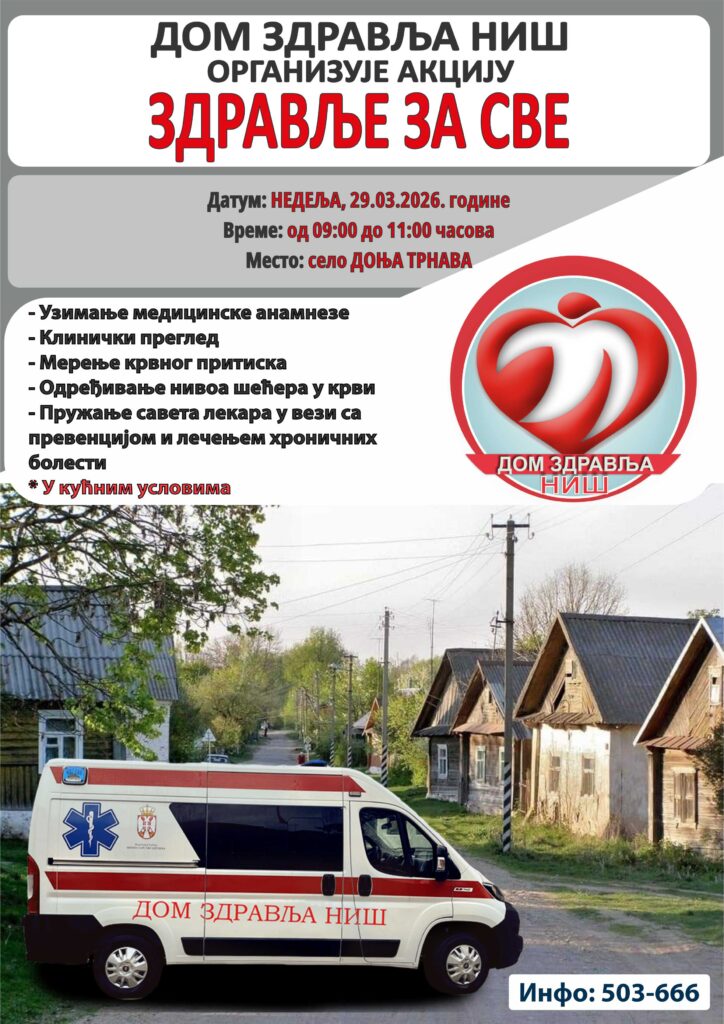 Приоритет акције „Здравље за све“ јесте брига о здрављу сваког појединца, нарочито оних који тешко долазе до лекара јер су непокретни или тешко покретни. Мештани села Доња Трнава 29.03.2026. године у периоду од 09:00 до 11:00 часова имаће прилику да провере своје здравље и да добију савете од стране мобилне екипе Дома здравља Ниш.