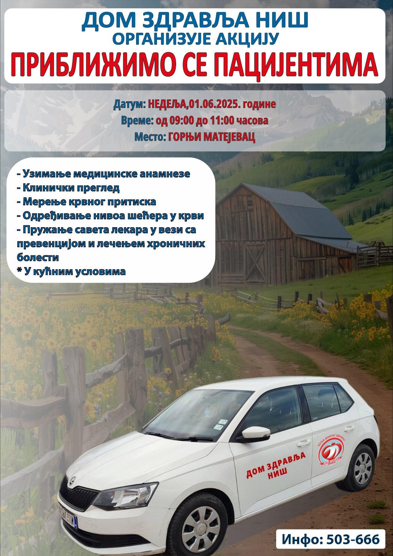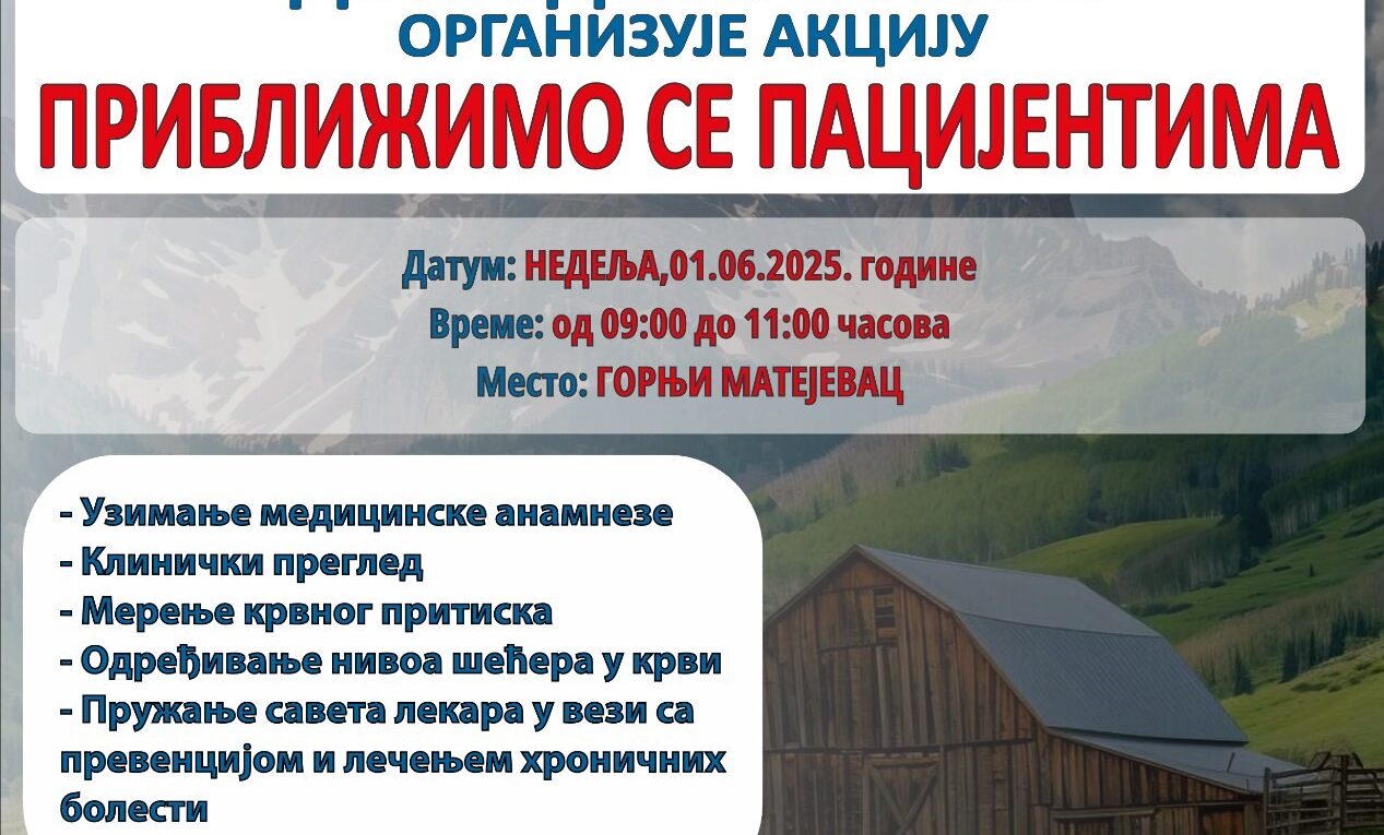 Приоритет акције „Приближимо се пацијентима“ јесте брига о здрављу сваког појединца, нарочито оних који тешко долазе до лекара јер су непокретни или тешко покретни. Мештани села Горњи Матејевац 01.06.2025. године у периоду од 09:00 до 11:00 часова имаће прилику да провере своје здравље и да добију савете од стране мобилне екипе Дома здравља Ниш.