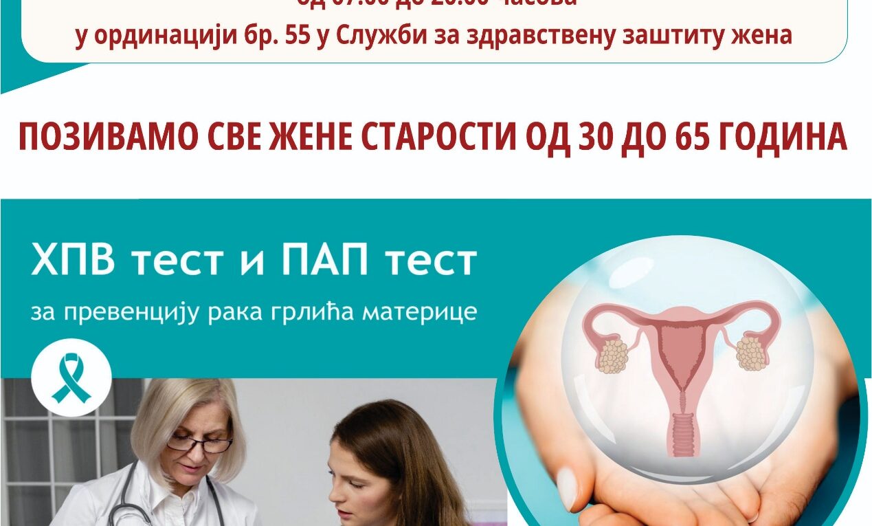 Служба за здравствену заштиту жена и овог викенда 11. и 12. јануара 2025. године, као и сваког радног дана на даље, у периоду од 07:00 до 20:00 часова, наставља са тестирањем жена старости од 30 до 65 година истовременом применом ХПВ и Папаниколау теста.