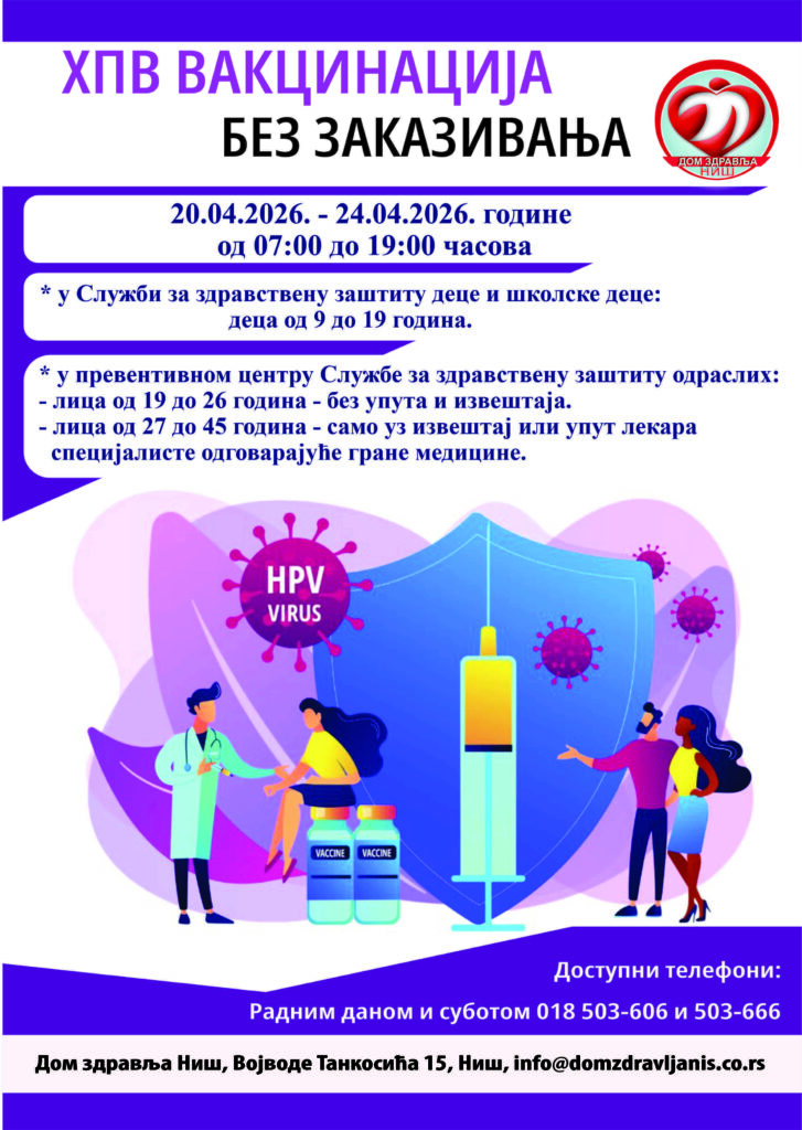 ХПВ ВАКЦИНАЦИЈА БЕЗ ЗАКАЗИВАЊА У ДОМУ ЗДРАВЉА НИШ