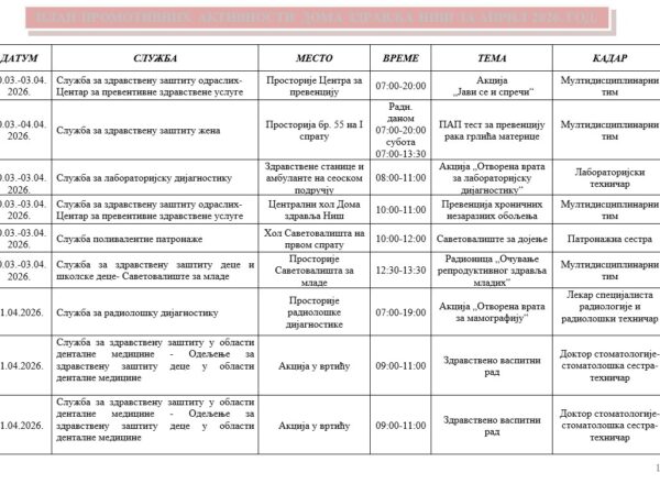 Дом здравља Ниш наставља са интензивним радом на очувању здравља наших грађана. Током априла, наше службе ће организовати разне превентивне прегледе у Дому здравља Ниш и на терену.Комплетан распоред са локацијама и сатницама можете погледати