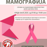 Дана 28.05.2025. године, у Служби за радиолошку дијагностику Дома здравља Ниш биће организована акција „Отворена врата за мамографију“ намењена женама старосне доби од 45 до 69 година живота без упута и заказивања.