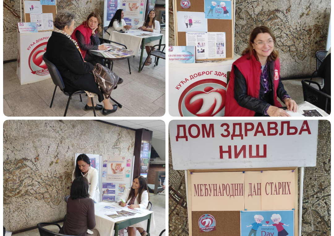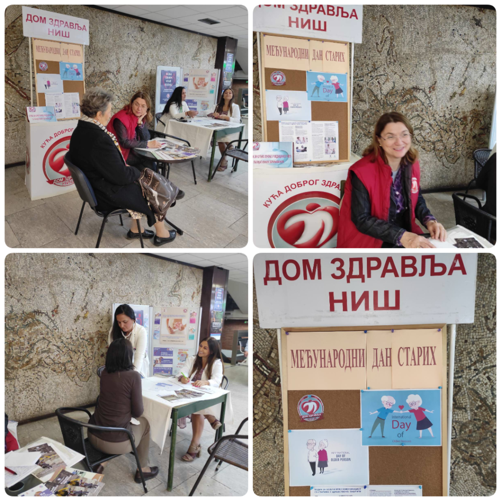 Дана 01.10.2025. године, Служба за кућно лечење, медицинску негу и палијативно збрињавање Дома здравља Ниш, у централном холу установе обележила је Међународни дан старих. Овом приликом су лекари, медицинске сестре и социјални радник разговарали са посетиоцима акције, делили савете на тему унапређења квалитета живота старих лица. Захваљујући бољем животном стандарду становништва, квалитетнијој здравственој заштити, просечан животни век људи у Србији продужава се из деценије у деценију.