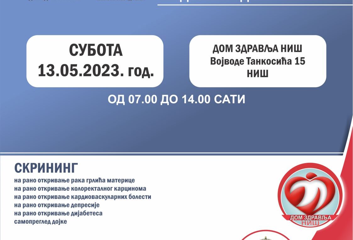 Aкцију превентивних и скрининг прегледа „Отворена врата“, Дом здравља Ниш организује и ове суботе 13.05.2023. године у централном објекту у периоду од 07:00 до 14:00 часова. Велико ангажовање медицинских екипа има за циљ да се на овај начин анимира велики број грађана да ураде превентивне и скрининг прегледе и тиме спрече настанак болести и компликација.