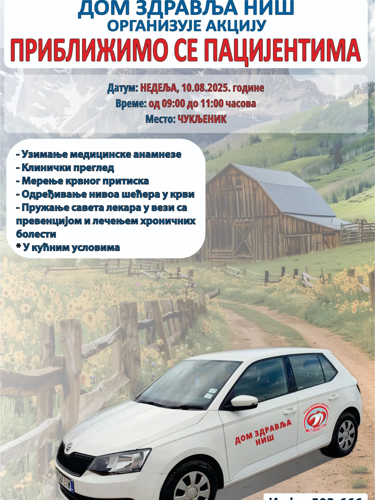 У недељу 10.08.2025. године, запослени у Дому здравља Ниш из Службе за здравствену заштиту одраслих омогућиће мештанима села Чукљеник да ураде здравствене прегледе и добију савете како да превенирају многе болести и спрече настанак компликација.