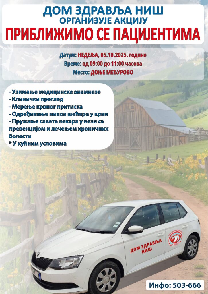У недељу 05.10.2025. године, запослени у Дому здравља Ниш из Службе за здравствену заштиту одраслих омогућиће мештанима села Доње Међурово да ураде здравствене прегледе и добију савете како да превенирају многе болести и спрече настанак компликација.
