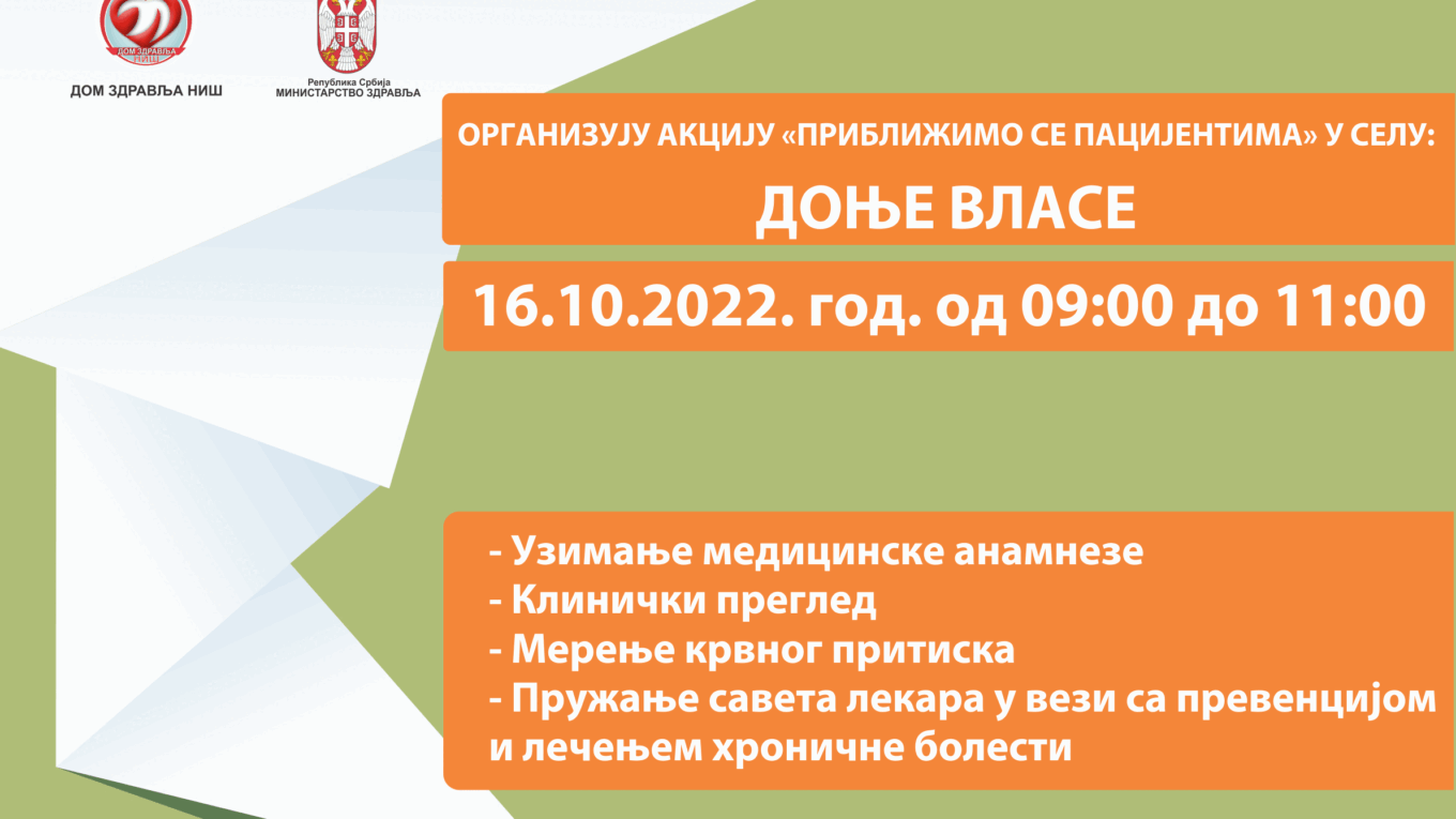 Дом здравља Ниш наставља са организацијом прегледа на сеоском подручју на договореној локацији у објекту или у кућним условима у 2022 години а под називом „Приближимо се пацијентима“. Прегледима ће бити обухваћена села на територији свих пет општина Града Ниша. У недељу 16.10.2022. године у периоду од 09:00 до 11:00 часова (просторија Месне заједнице) у селу Доње Власе.