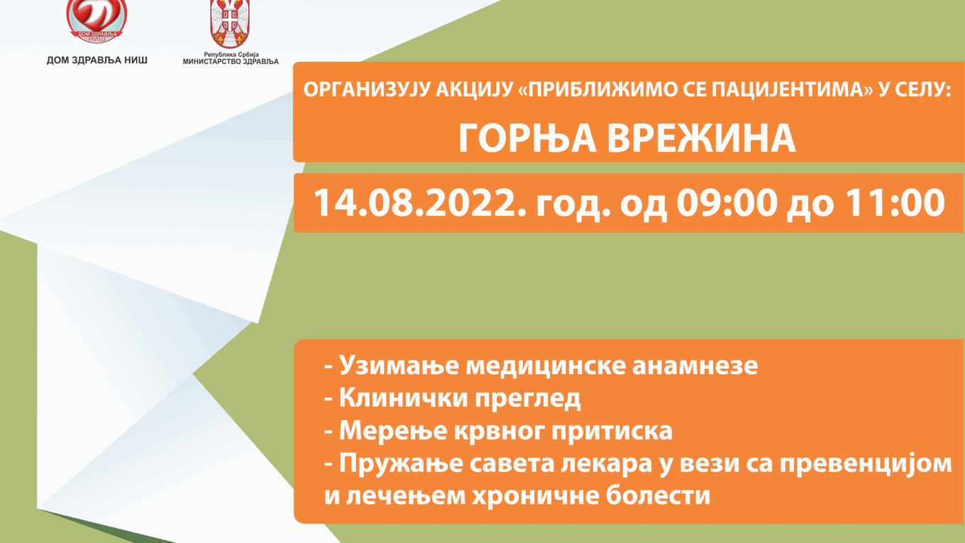 НАЈАВА – АКЦИЈА „ПРИБЛИЖИМО СЕ ПАЦИЈЕНТИМА“ У СЕЛУ ГОРЊА ВРЕЖИНА- 14.08.2022.