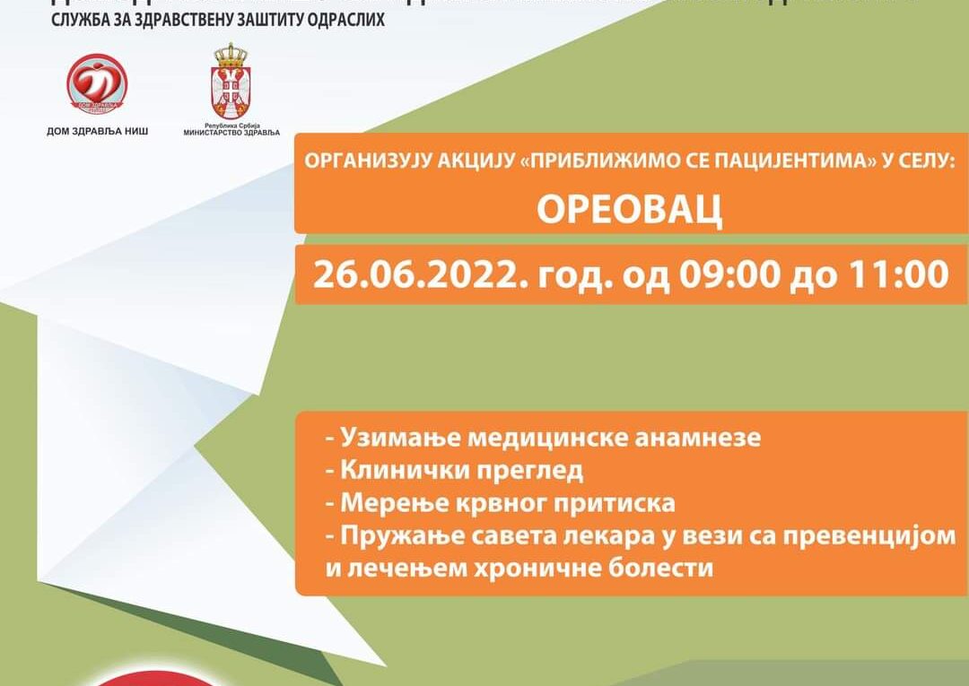 НАЈАВА – АКЦИЈА „ПРИБЛИЖИМО СЕ ПАЦИЈЕНТИМА“ У СЕЛУ ОРЕОВАЦ- 26.06.2022.год.