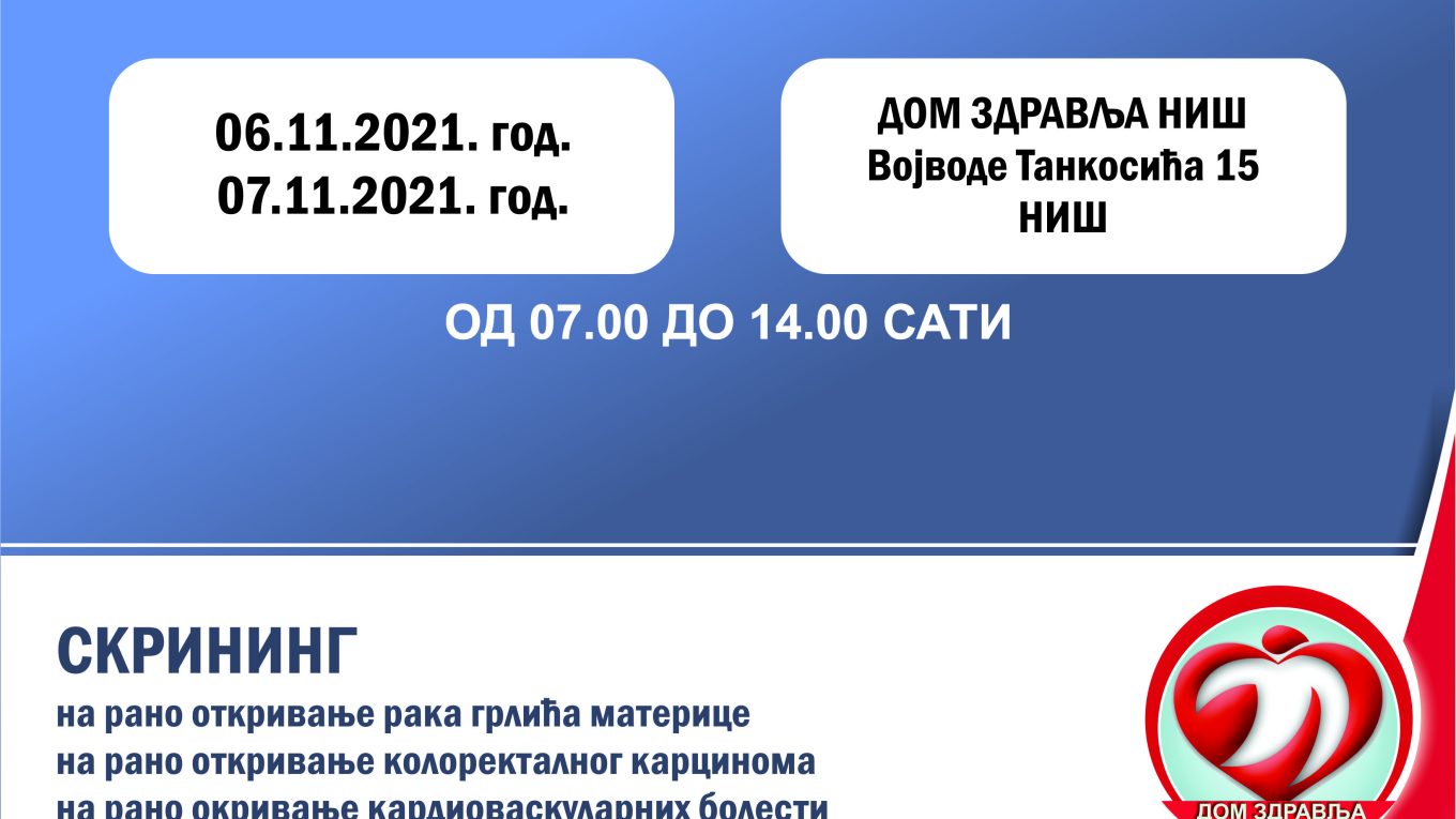 У Дому здравља Ниш за оне суграђане који то још нису урадили на предходно организованим акцијама, биће омогућена нова акција „Отворена врата“, 06. и 07.11.2021. године у периоду од 07:00 до 14:00 часова у централном холу и тиме пружена нова шанса за реализацију превентивних прегледа и скрининг програма.
