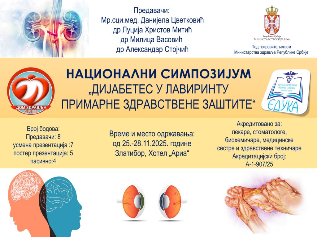 У организацији Дома здравља Ниш и Удружења здравствених радника и сарадника Нишавског округа „Едука“, а под покровитељством Министарства здравља Републике Србије одржаће се симпозујум „Дијабетес у лавиринту примарне здравствене заштите“.