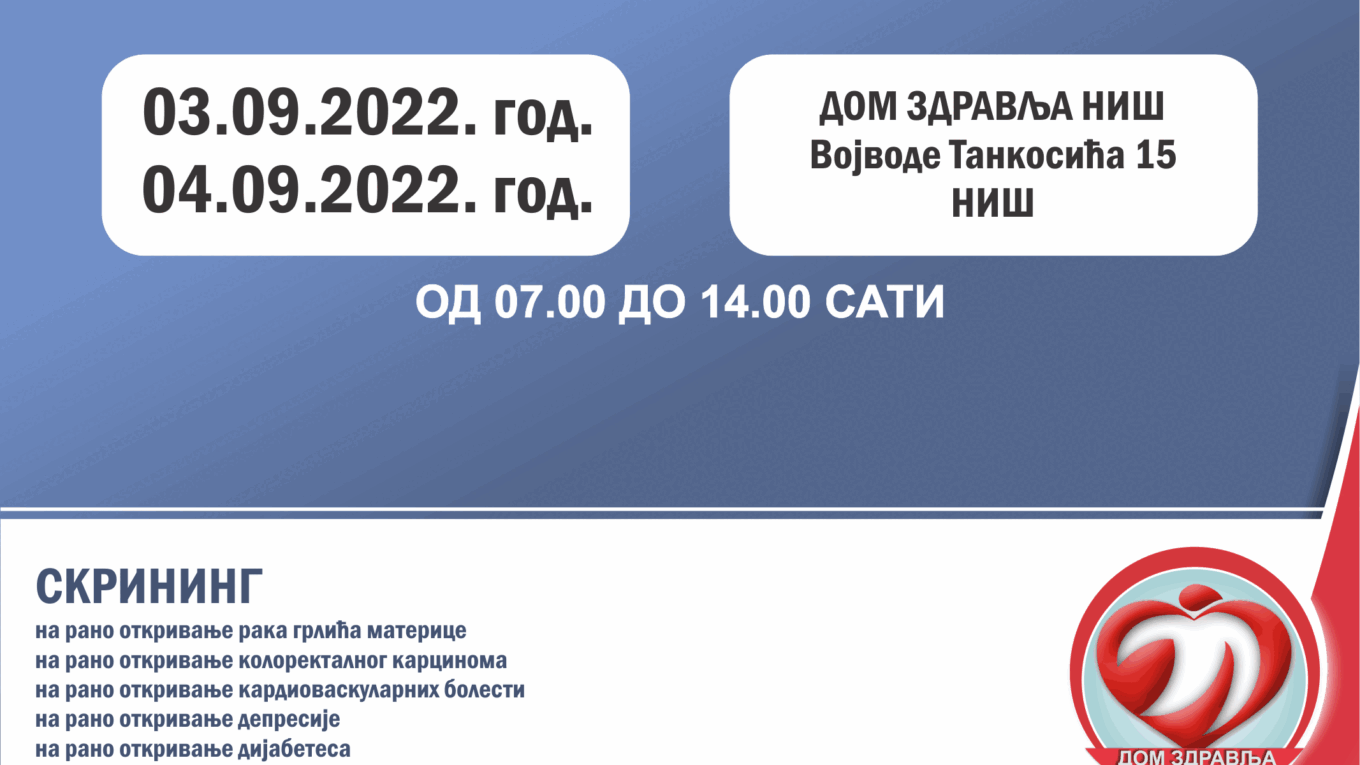НАЈАВА!!! „ОТВОРЕНА ВРАТА“ ЗА ПРЕВЕНТИВНЕ ПРЕГЛЕДЕ У ДОМУ ЗДРАВЉА НИШ СУБОТА 03. СЕПТЕМБАР И НЕДЕЉА 04. СЕПТЕМБАР 2022. ГОДИНЕ