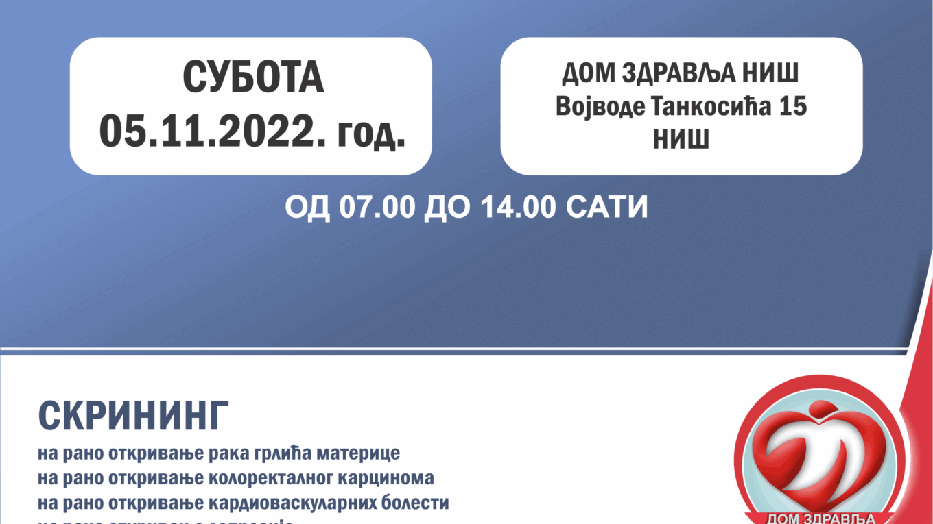 НАЈАВА!!! „ОТВОРЕНА ВРАТА“ ЗА ПРЕВЕНТИВНЕ ПРЕГЛЕДЕ У ДОМУ ЗДРАВЉА НИШ СУБОТА 05. НОВЕМБАР 2022. ГОДИНЕ