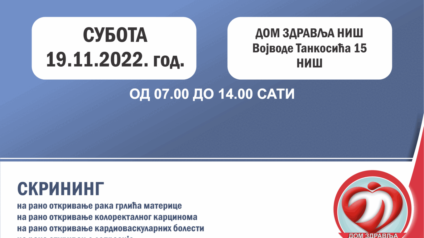 НАЈАВА!!! „ОТВОРЕНА ВРАТА“ ЗА ПРЕВЕНТИВНЕ ПРЕГЛЕДЕ У ДОМУ ЗДРАВЉА НИШ СУБОТА 19. НОВЕМБАР 2022. ГОДИНЕ