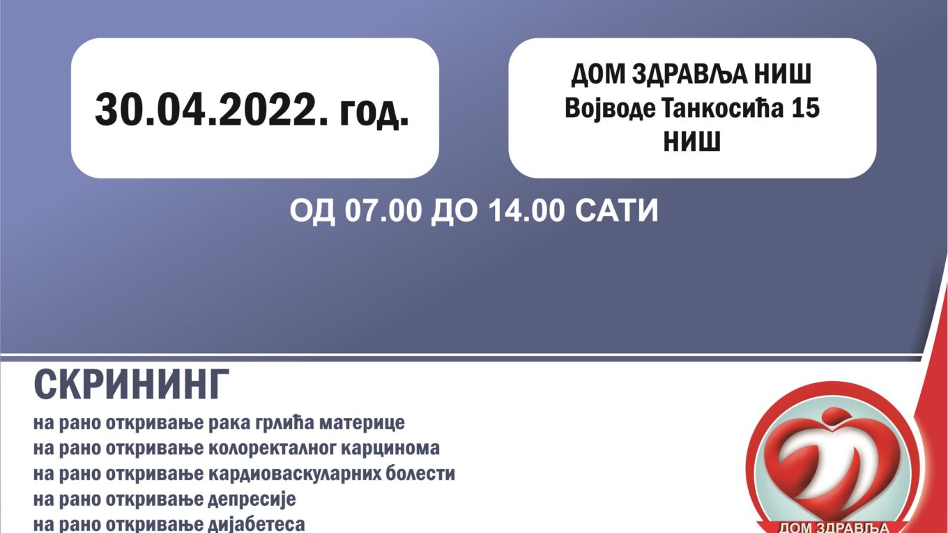 НАЈАВА!!! „ОТВОРЕНА ВРАТА“ ЗА ПРЕВЕНТИВНЕ ПРЕГЛЕДЕ У ДОМУ ЗДРАВЉА НИШ СУБОТА 30. АПРИЛ 2022. ГОДИНЕ