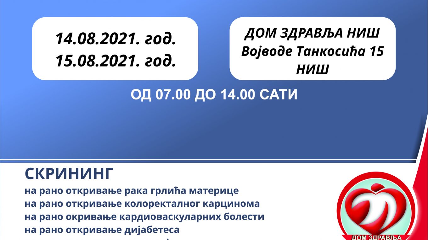 НАЈАВА!!!    „ОТВОРЕНА ВРАТА“ ЗА СКРИНИНГ ПРЕГЛЕДЕ У ДОМУ ЗДРАВЉА НИШ – СУБОТА 14. август и НЕДЕЉА 15. август 2021. године