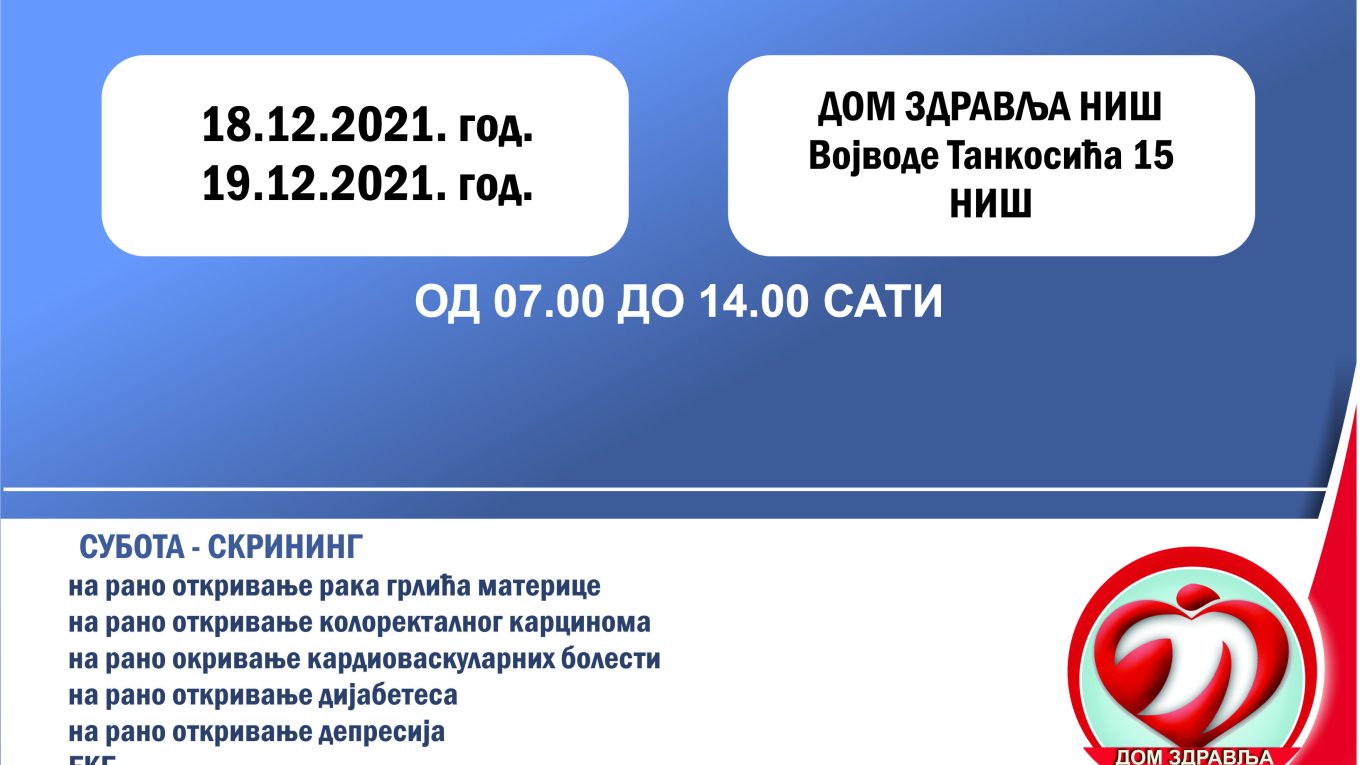 НАЈАВА!!! „ОТВОРЕНА ВРАТА“ ЗА СКРИНИНГ ПРЕГЛЕДЕ У ДОМУ ЗДРАВЉА НИШ СУБОТА 18. децембар и НЕДЕЉА 19. децембар 2021. године