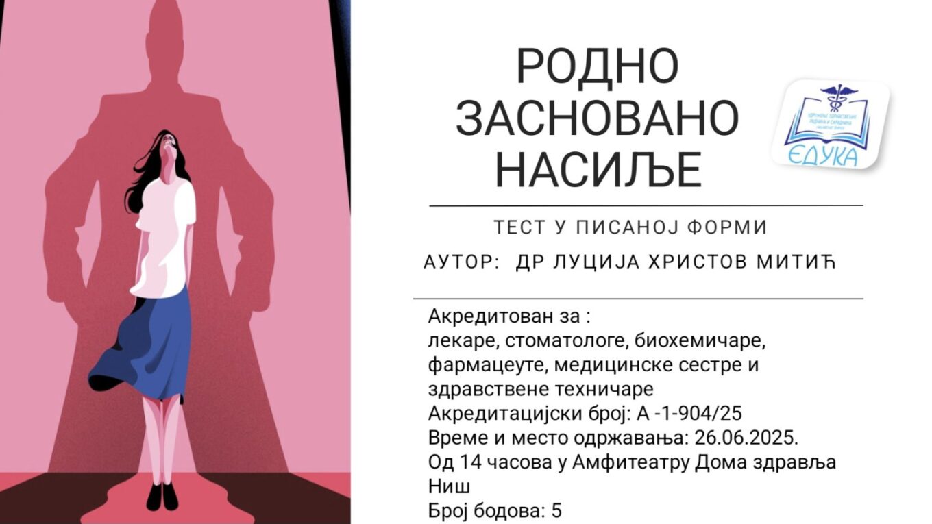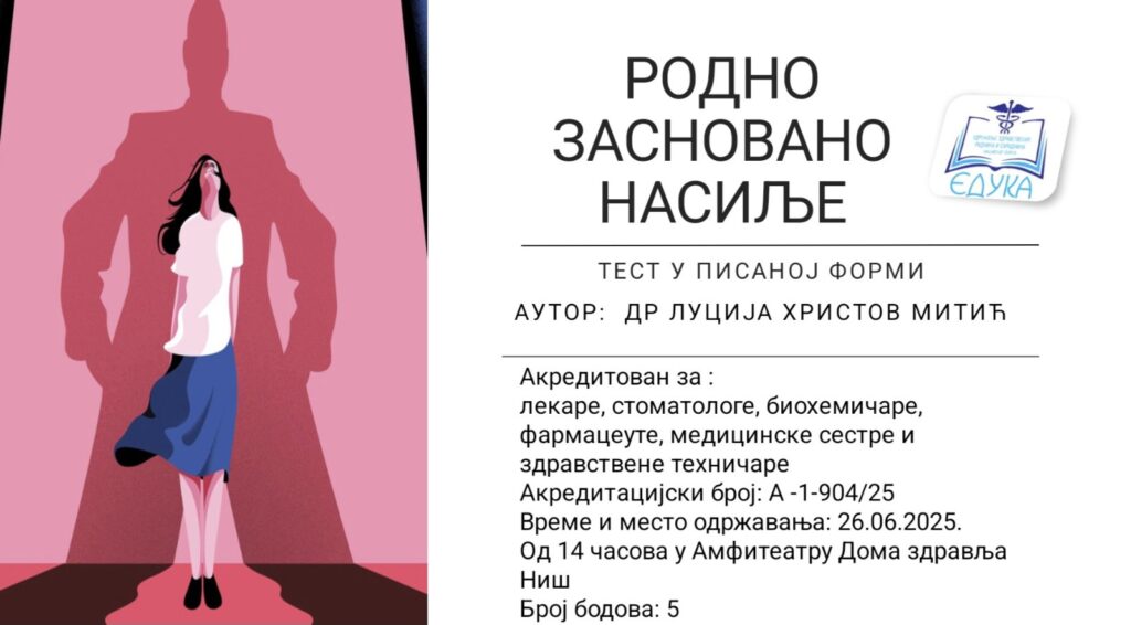 Програм континуиране медицинске едукације – тест у писаној форми под називом „Родно засновано насиље“ биће одржан дана 26.06.2025. године од 14:00 часова у Амфитеатру Дома здравља Ниш.