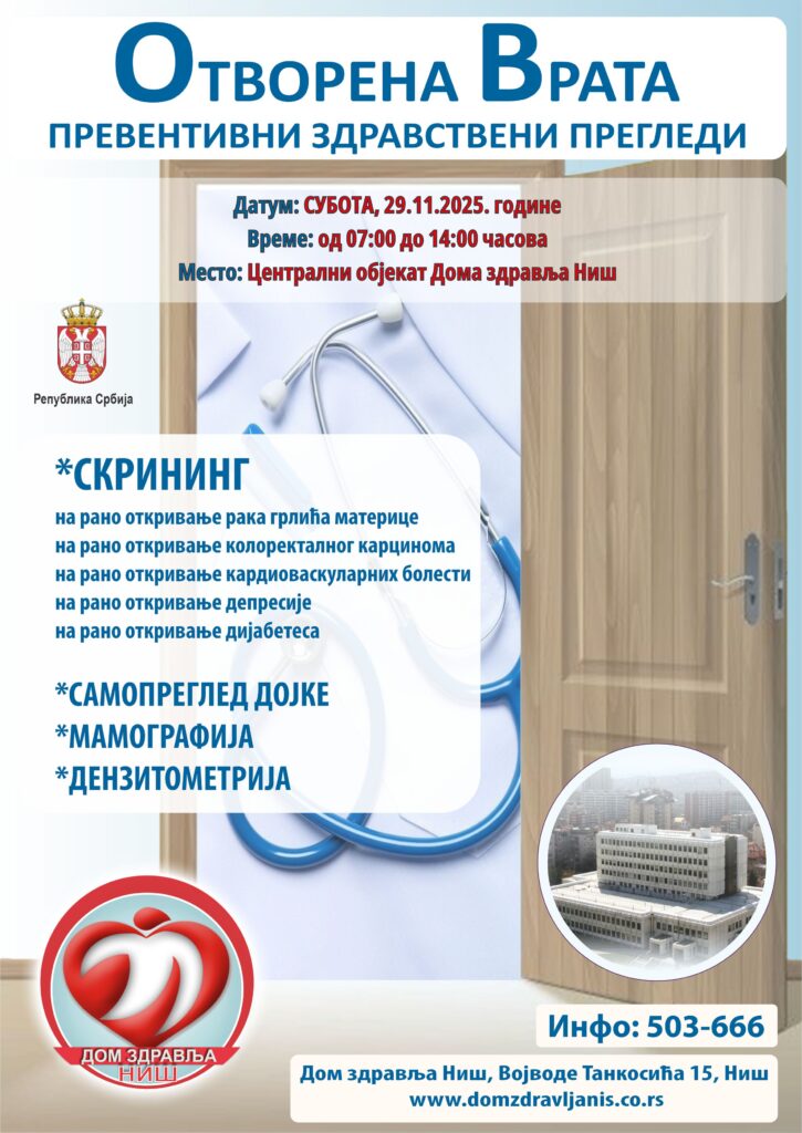 Са жељом да вам запослени из Дома здравља Ниш помогну у тој мисији, организована је акција „Отворена врата“ у суботу 29.11.2025. године у периоду од 07:00 до 14:00 часова током које грађани могу урадити велики број превентивних и скрининг прегледа, ПАПА тест, мамографија, дермоскопија и многи други.