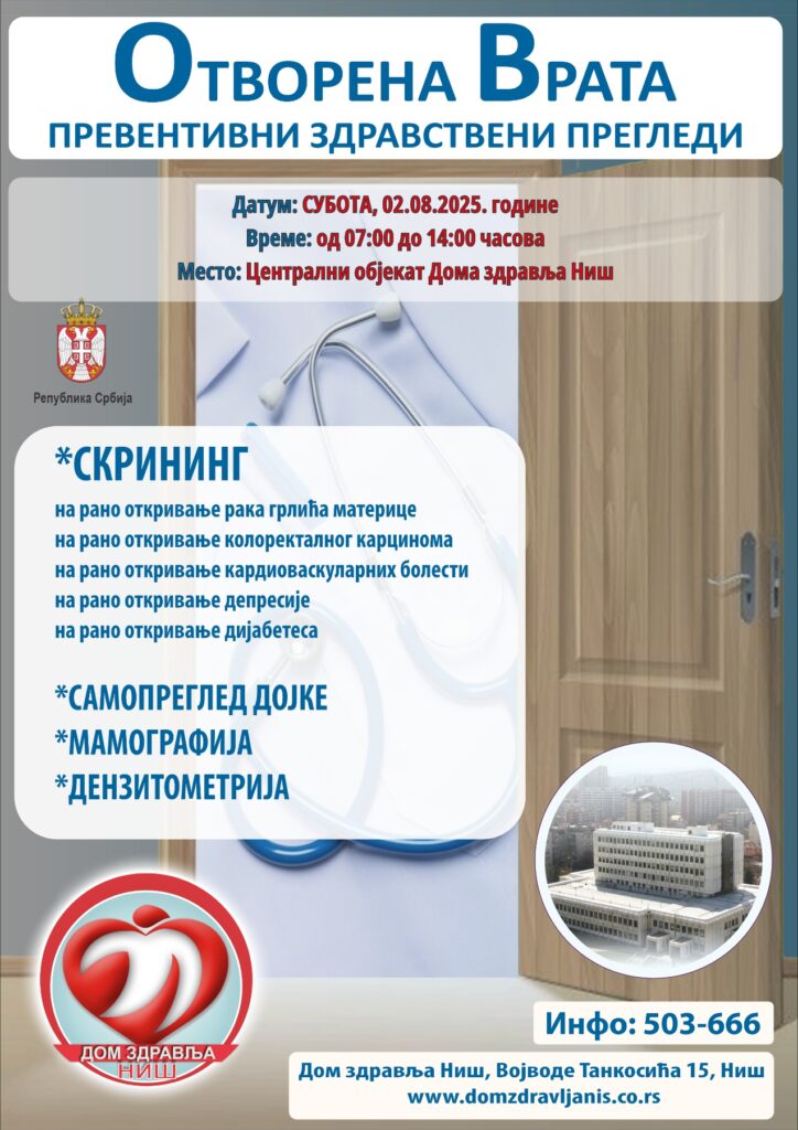 Са жељом да вам запослени из Дома здравља Ниш помогну у тој мисији, организована је акција „Отворена врата“ у суботу 02.08.2025. године у периоду од 07:00 до 14:00 часова током које грађани могу урадити велики број превентивних и скрининг прегледа, ПАПА тест, мамографију и многe друге.