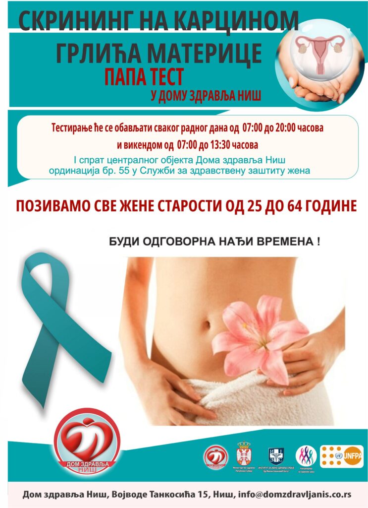 Позивамо и подсећамо све жене старости од 25 до 64 године да и даље могу урадити ПАПА тестирање у Дому здравља Ниш, радним данима у времену од 07:00 до 20:00 часова и викендом од 07:00 до 13:30 часова у просторији број 55.