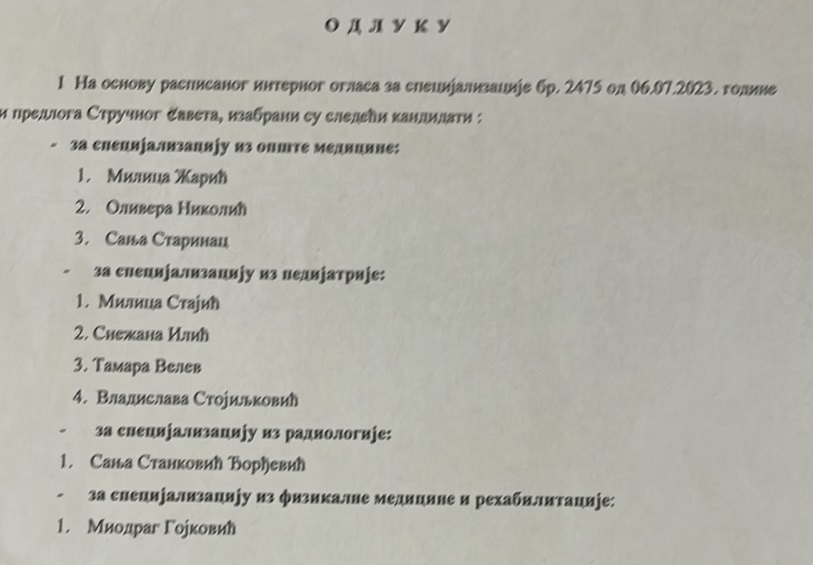На основу расписаног интерног огласа за специјализације бр. 2475 од 06.07.2023. године и предлога Стручног савета, изабрани су следећи кандидати…