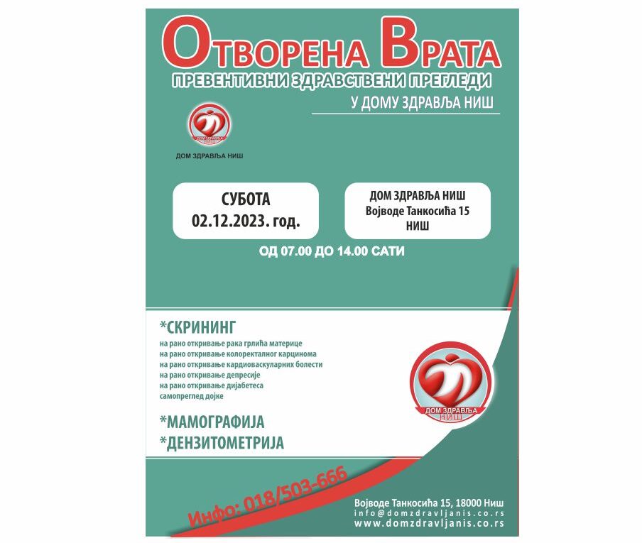 Aкцију превентивних и скрининг прегледа „Отворена врата“, Дом здравља Ниш организује и ове суботе 02.12.2023. године у централном објекту у периоду од 07:00 до 14:00 часова.
