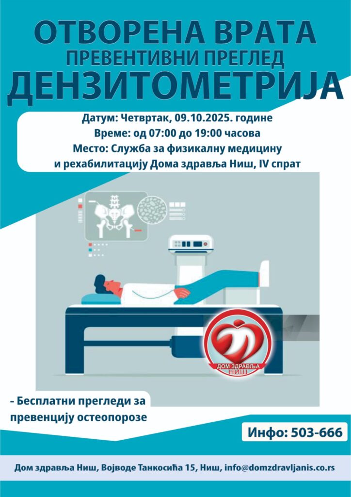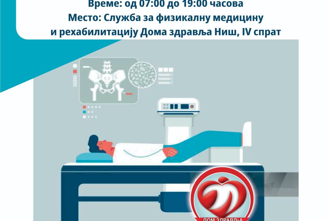 У четвртак 09.10.2025. године у периоду од 07:00 до 19:00 часова Служба за физикалну медицину и рехабилитацију Дома здравља Ниш у оквиру акције “Отворена врата за дензитометрију” организује преглед одређивања минералне густине костију.