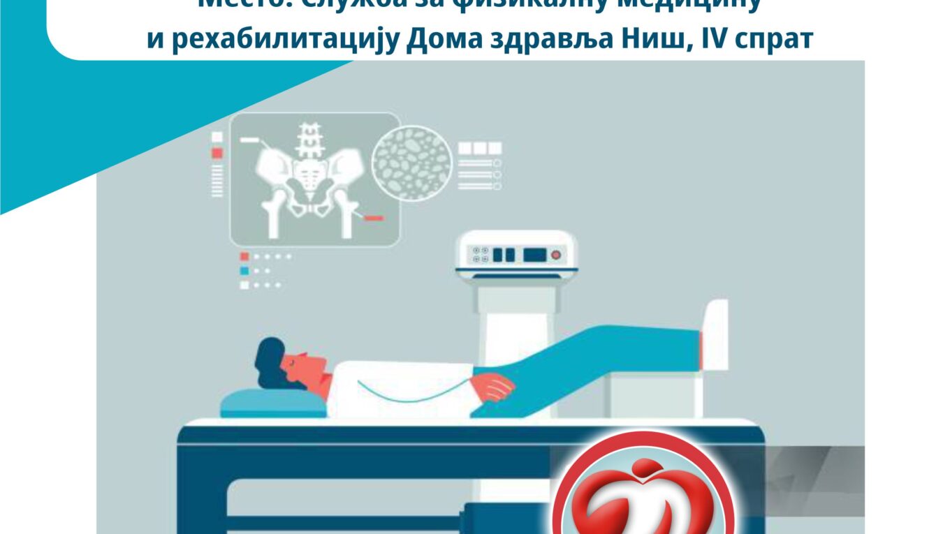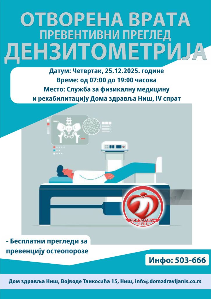 У четвртак 25.12.2025. године у периоду од 07:00 до 19:00 часова Служба за физикалну медицину и рехабилитацију Дома здравља Ниш у оквиру акције Отворена врата за превентивне прегледе, организује преглед одређивања минералне густине костију – дензитометрију.
