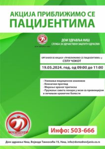 Овог викенда у недељу 19.05.2024. године, медицинска екипа Дома здравља Ниш обавиће прегледе мештана села Чокот под називом „Приближимо се пацијентима“. Осим основних дијагностичких процедура, заинтересованим особама биће урађени скрининг прегледи на хроничне незаразне болести.