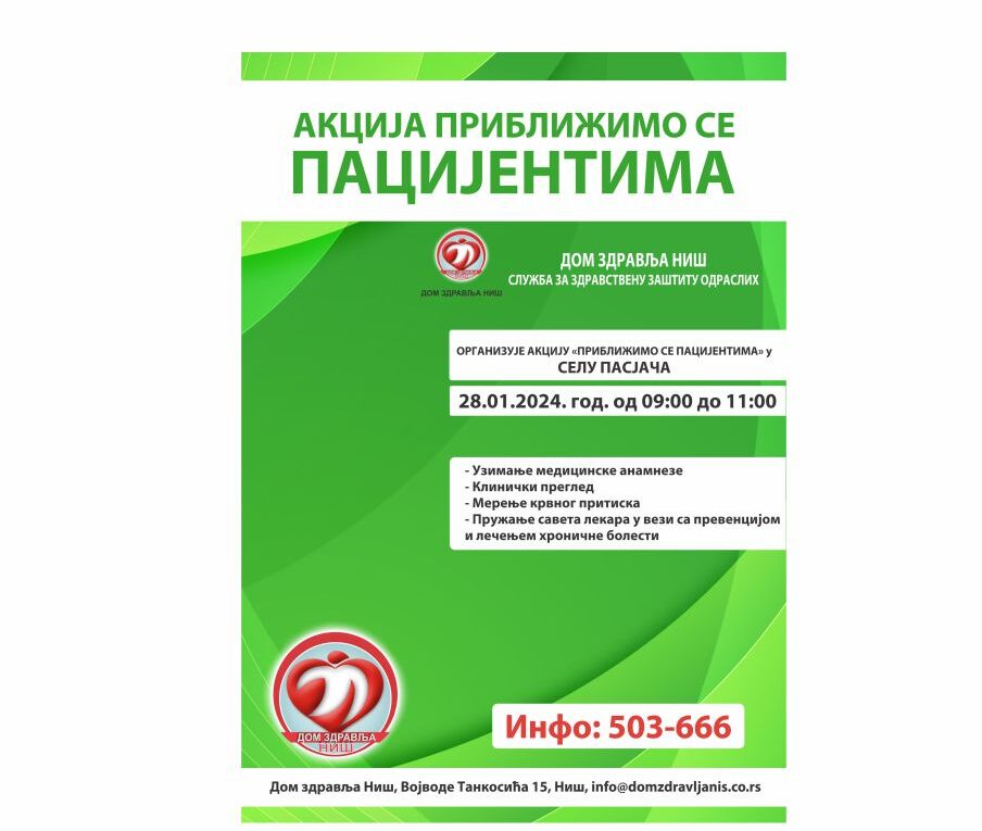 Овог викенда у недељу 28.01.2024. године, медицинска екипа Дома здравља Ниш обавиће прегледе мештана села Пасјача под називом „Приближимо се пацијентима“. Осим основних дијагностичких процедура, заинтересованим особама биће урађени скрининг прегледи на хроничне незаразне болести.