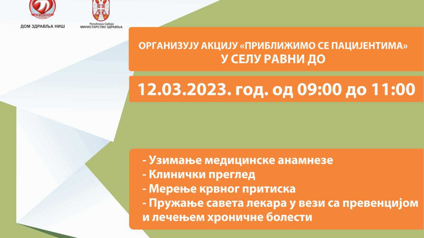 Овог викенда у недељу 12.03.2023. године, медицинска екипа Дом здравља Ниш обавиће прегледе мештана села Равни До под називом „Приближимо се пацијентима“. Осим основних дијагностичких процедура, заинтересованим особама биће урађени скрининг прегледи на хроничне незаразне болести.