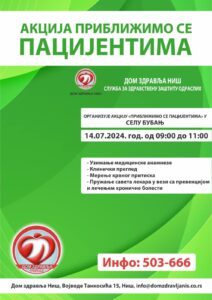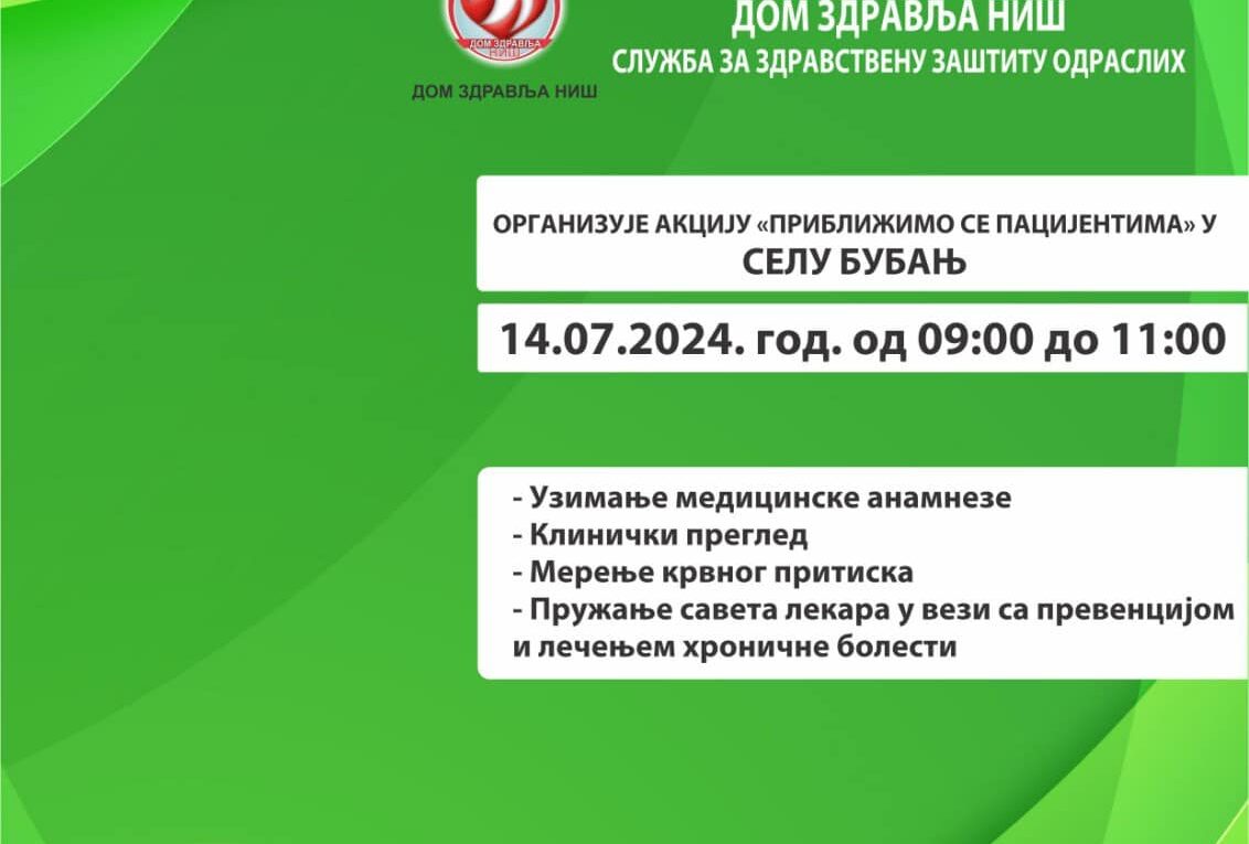 Овог викенда у недељу 14.07.2024. године, медицинска екипа Дома здравља Ниш обавиће прегледе мештана села Бубањ под називом „Приближимо се пацијентима“. Осим основних дијагностичких процедура, заинтересованим особама биће урађени скрининг прегледи на хроничне незаразне болести.