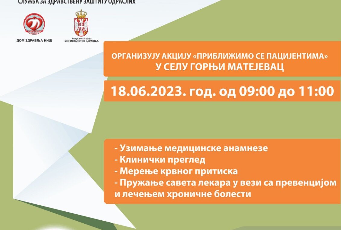 Овог викенда у недељу 18.06.2023. године, медицинска екипа Дома здравља Ниш обавиће прегледе мештана села Горњи Матејевац под називом „Приближимо се пацијентима“. Осим основних дијагностичких процедура, заинтересованим особама биће урађени скрининг прегледи на хроничне незаразне болести.
