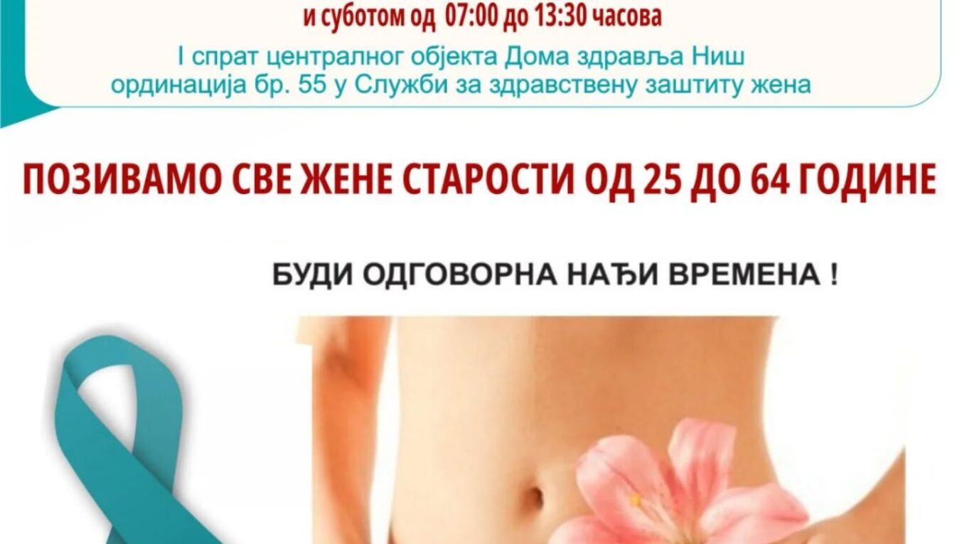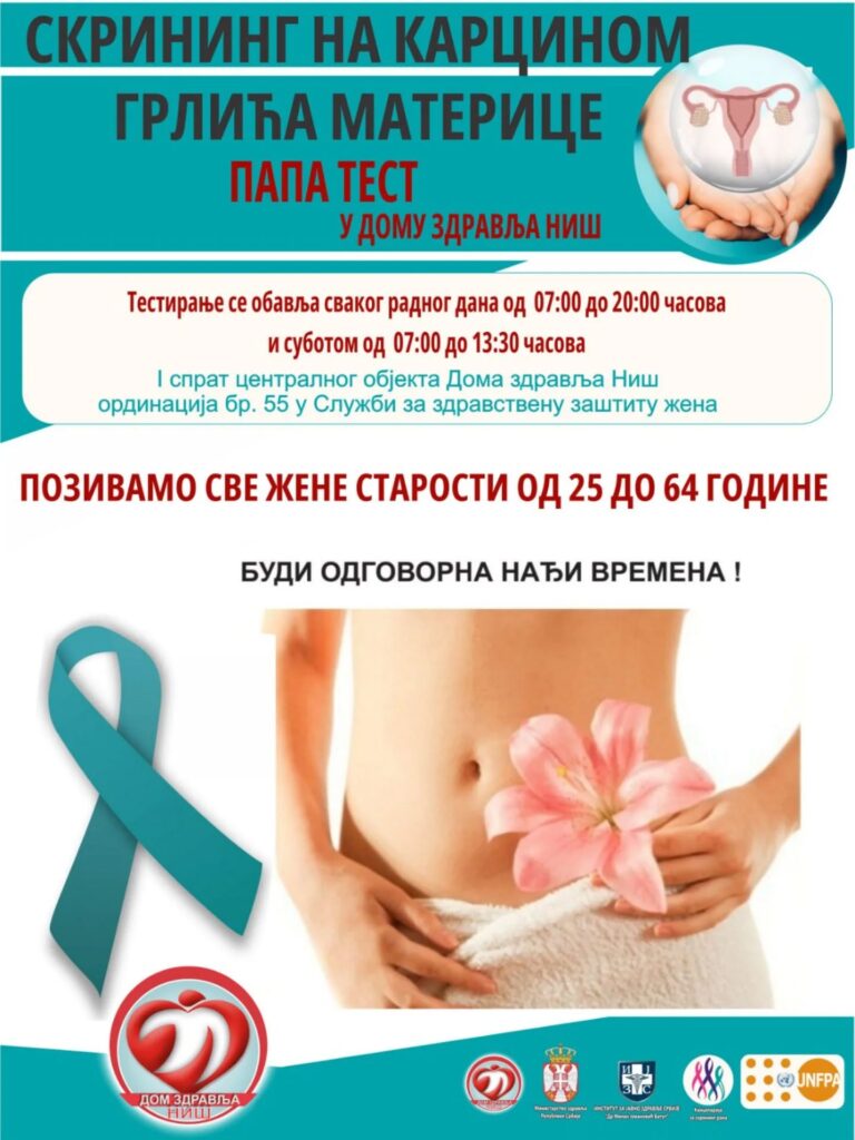 Позивамо и подсећамо све жене старости од 25 до 64 године да и даље могу урадити ПАПА тестирање у Дому здравља Ниш, радним данима у времену од 07:00 до 20:00 часова, а суботом од 07:00 до 13:30 часова  у просторији број 55.
