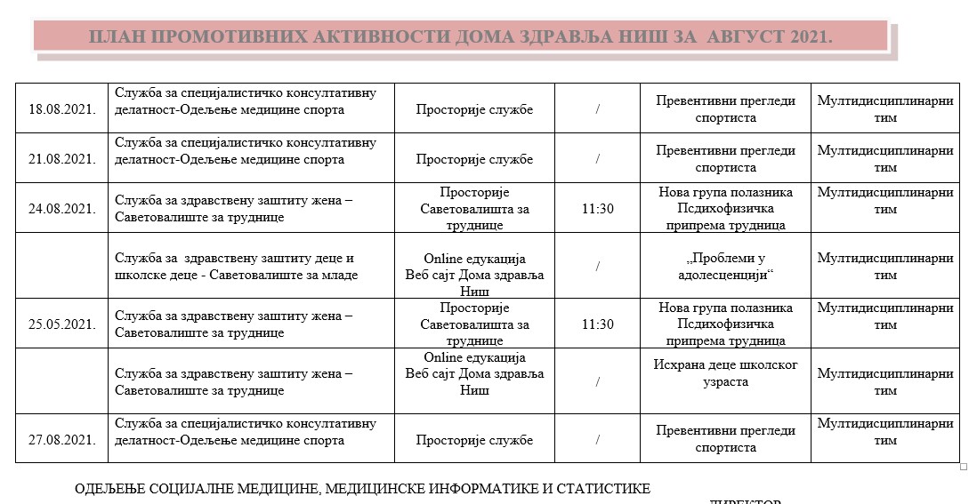 ПЛАН ПРОМОТИВНИХ АКТИВНОСТИ ДОМА ЗДРАВЉА НИШ ЗА АВГУСТ 2021.Објављено дана: 10.08.2021 аутор Dom Zdravlja Број прегледа: 82 Share on Facebook Share Share on TwitterTweet Send email Mail Print Print