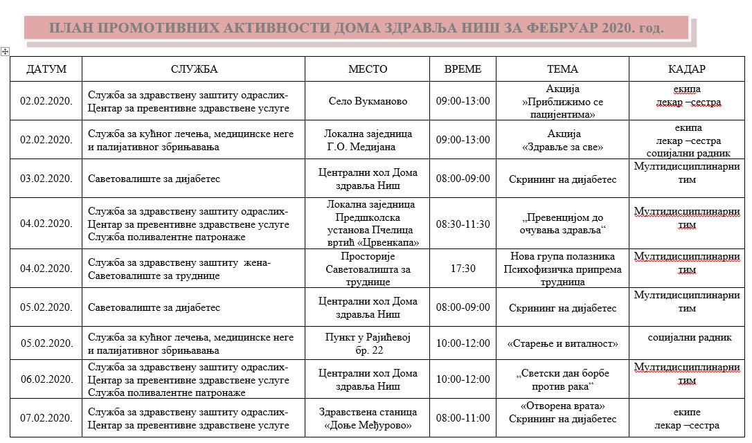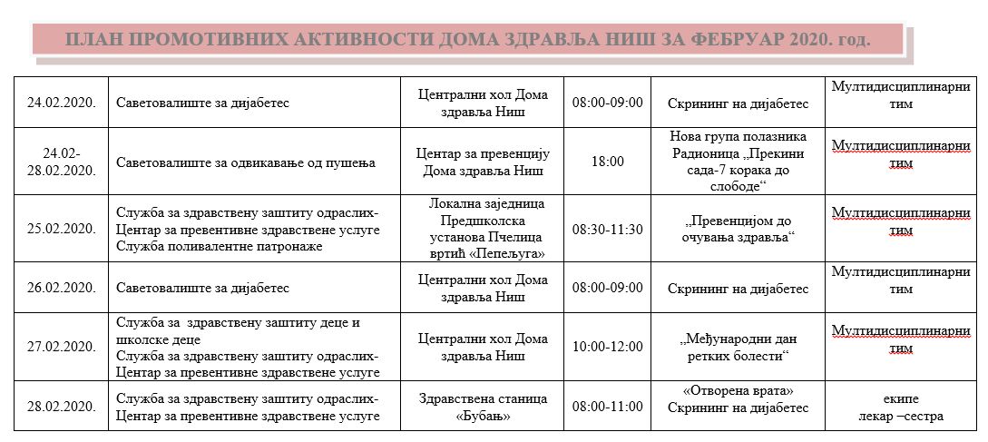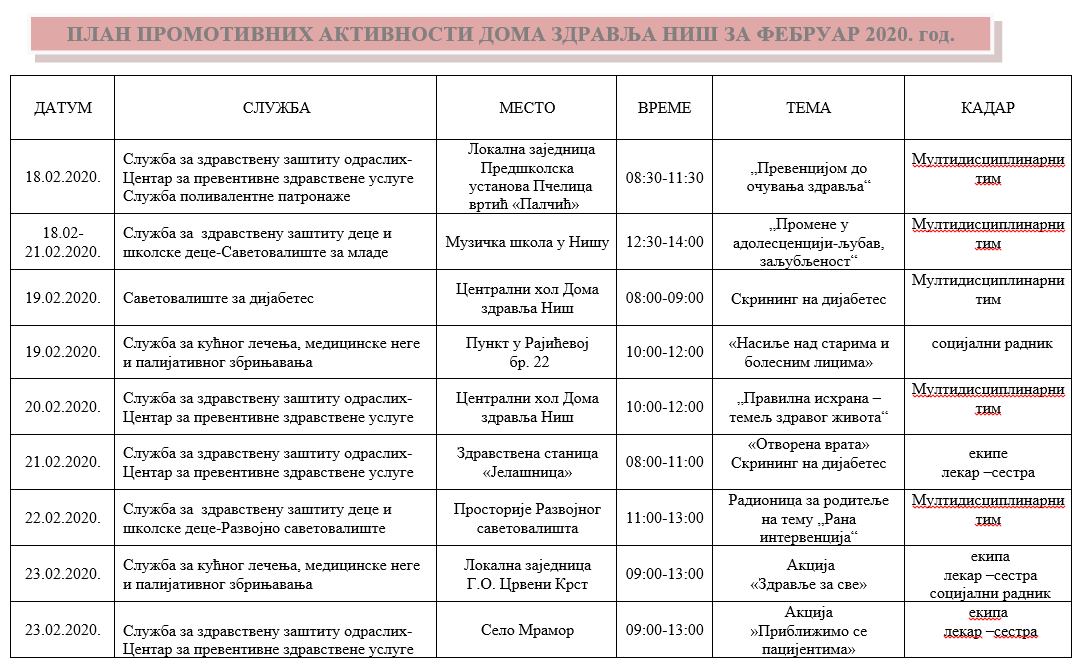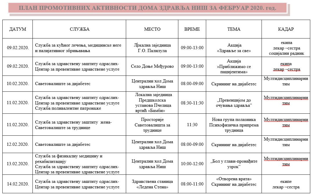 ПЛАН ПРОМОТИВНИХ АКТИВНОСТИ ДОМА ЗДРАВЉА НИШ ЗА ФЕБРУАР 2020. ГОДИНЕ