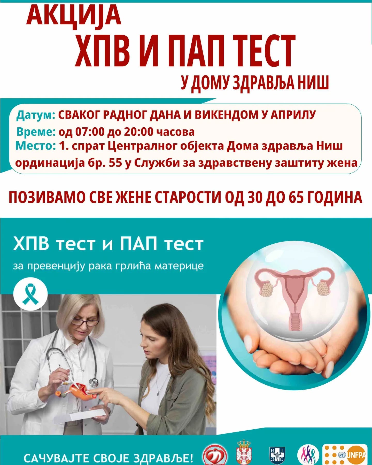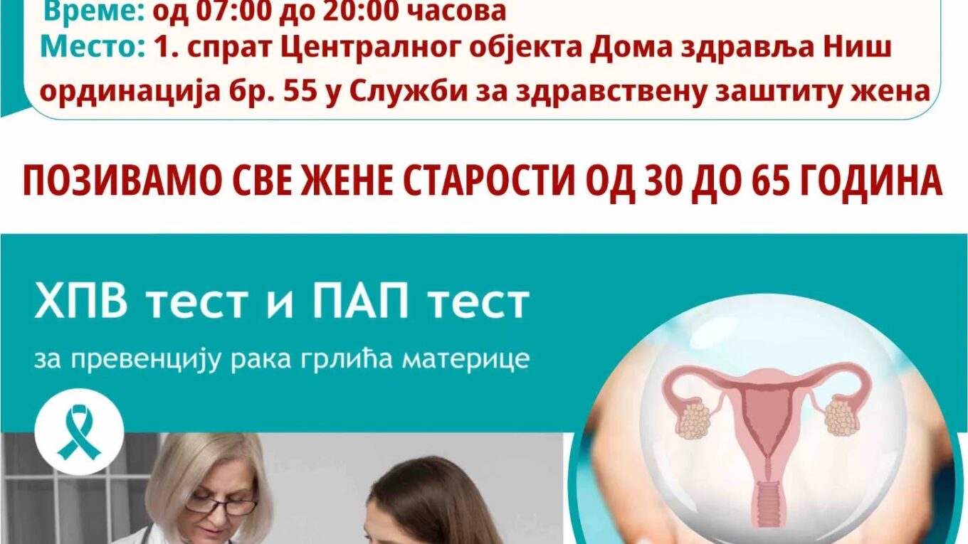 Позивамо и подсећамо све жене старости од 30 до 65 година да могу урадити истовремено ПАПА теститрање и ХПВ типизацију у Дому здравља Ниш, у времену од од 07:00 до 13:30 часова у просторији број 55 сваког радног дана и викендом.