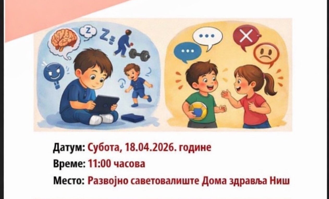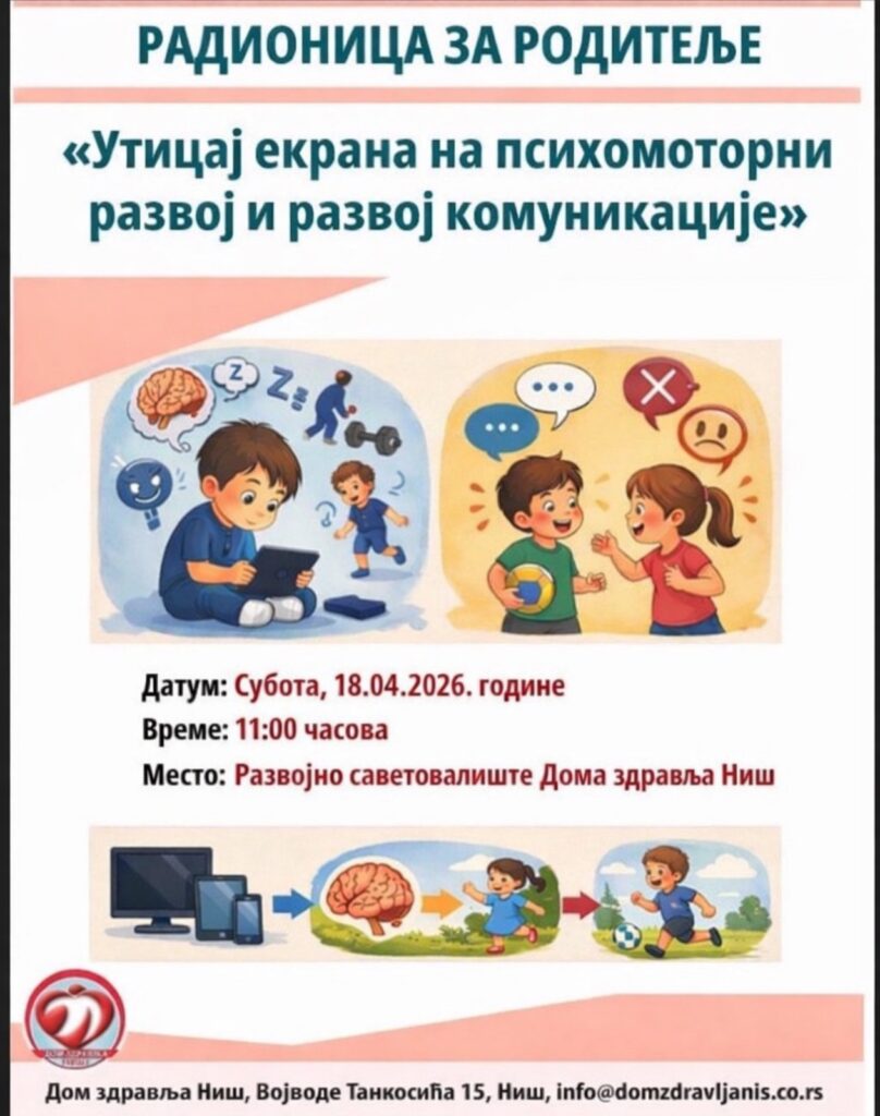 У суботу, 18.04.2026. године, са почетком у 11:00 часова, у просторији Развојног саветовалишта Дома здравља Ниш, организована је још једна у низу радионица за родитеље. Тема овонедељне радионице је „Утицај екрана на психомоторни развој и развој комуникације“.