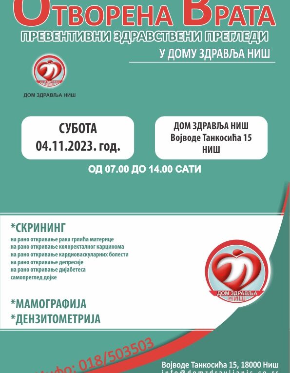 Дом здравља Ниш организује акцију превентивних и скрининг прегледа „Отворена врата“, у суботу 04.11.2023. године у централном објекту у периоду од 07:00 до 14:00 часова. Велико ангажовање медицинских екипа има за циљ да се на овај начин анимира велики број грађана да ураде превентивне и скрининг прегледе и тиме спрече настанак болести и компликација.