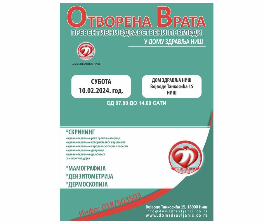 Дом здравља Ниш организује акцију превентивних и скрининг прегледа „Отворена врата“, у суботу 10.02.2024. године у централном објекту у периоду од 07:00 до 14:00 часова. Организовани су следећи превентивни и скрининг прегледи: