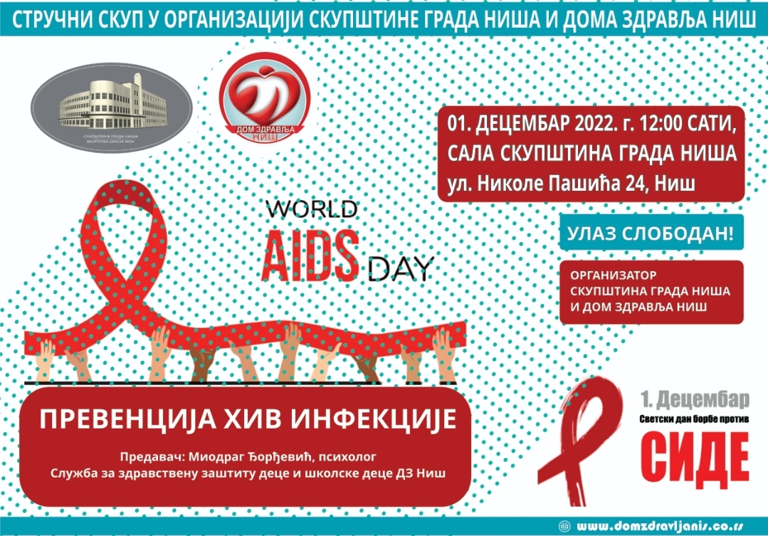Дом здравља Ниш, Служба за здравствену заштиту деце и школске деце- Саветовалиште за младе у сарадњи са Скупштином града Ниша, у сали Скупштинe града Ниша, у четвртак 01.12.2022. године са почетком у 12:00 часова организује предавање на тему ,,Превенција ХИВ-а “, предавач Миодраг Ђорђевић.