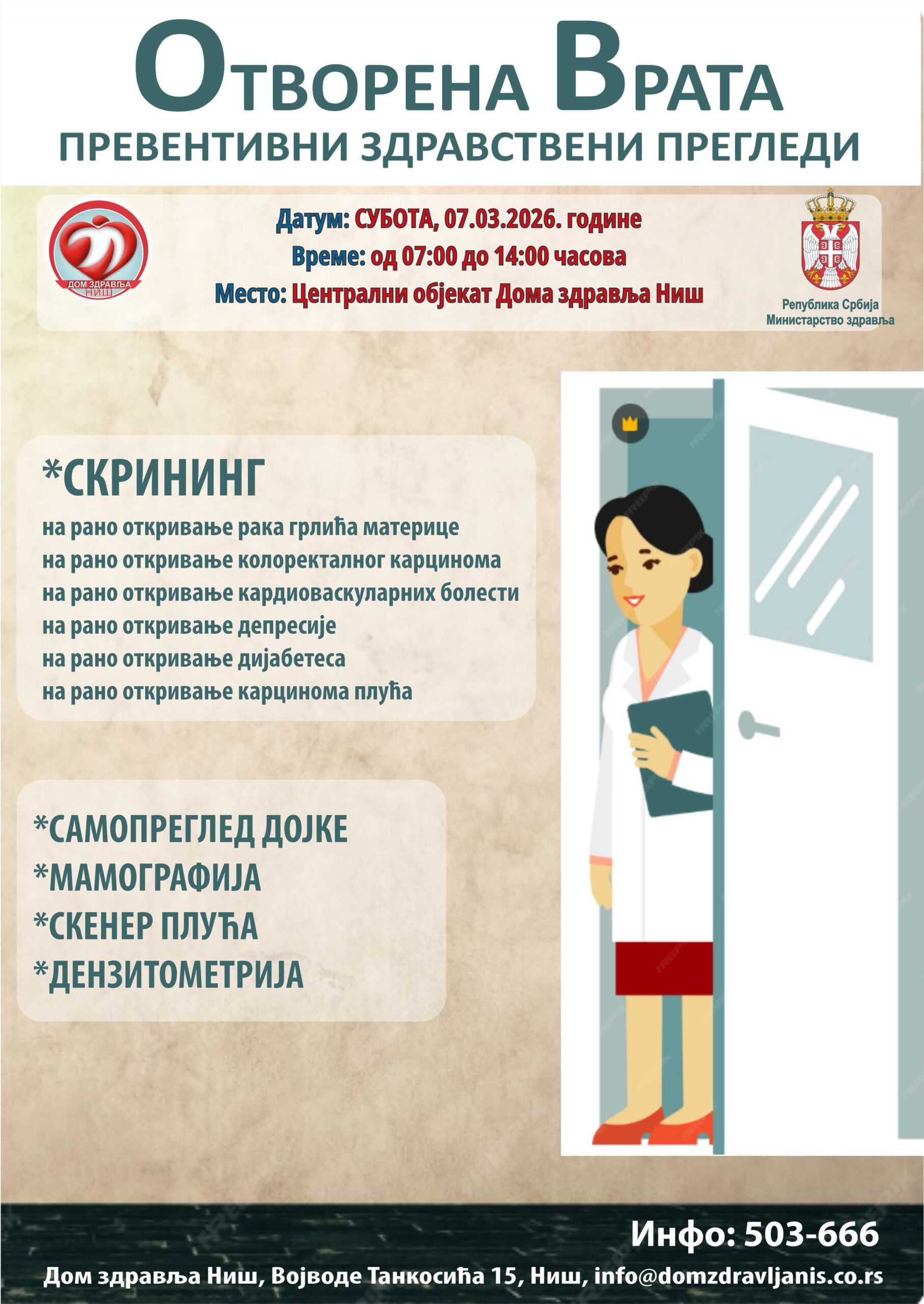 Дом здравља Ниш је у оквиру акције„Отворена врата“, у суботу 07.03.2026. године у централном објекту у периоду од 07:00 до 14:00 часова, припремио јединствен пакет превентивних и скрининг прегледа: