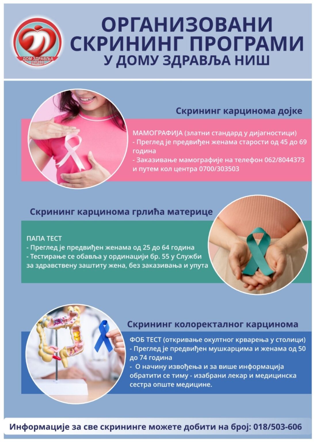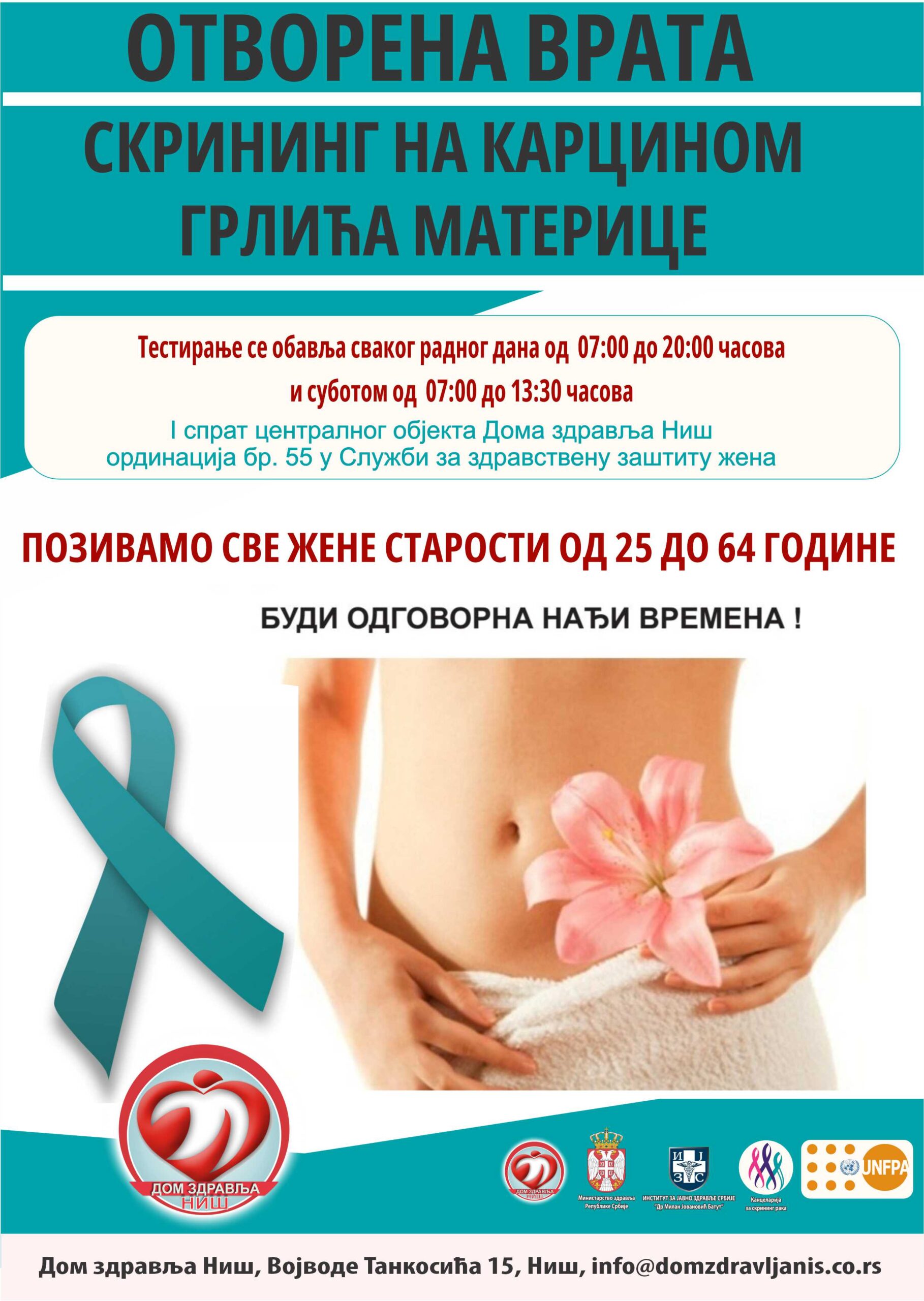 - Служба за здравствену заштиту жена позива све жене старосне доби од 25-64 године да ураде скрининг на рано откривање карцинома грлића материце – ПАПА тест. Узимање бриса радиће се на I спрату, ординација бр.55, у простору Службе за здравствену заштиту жена у централном објекту Дома здравља Ниш.
